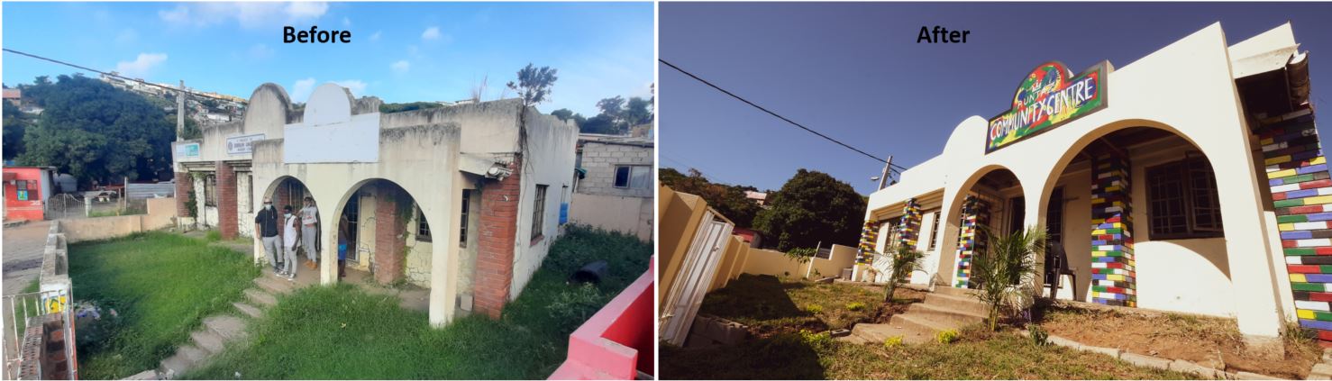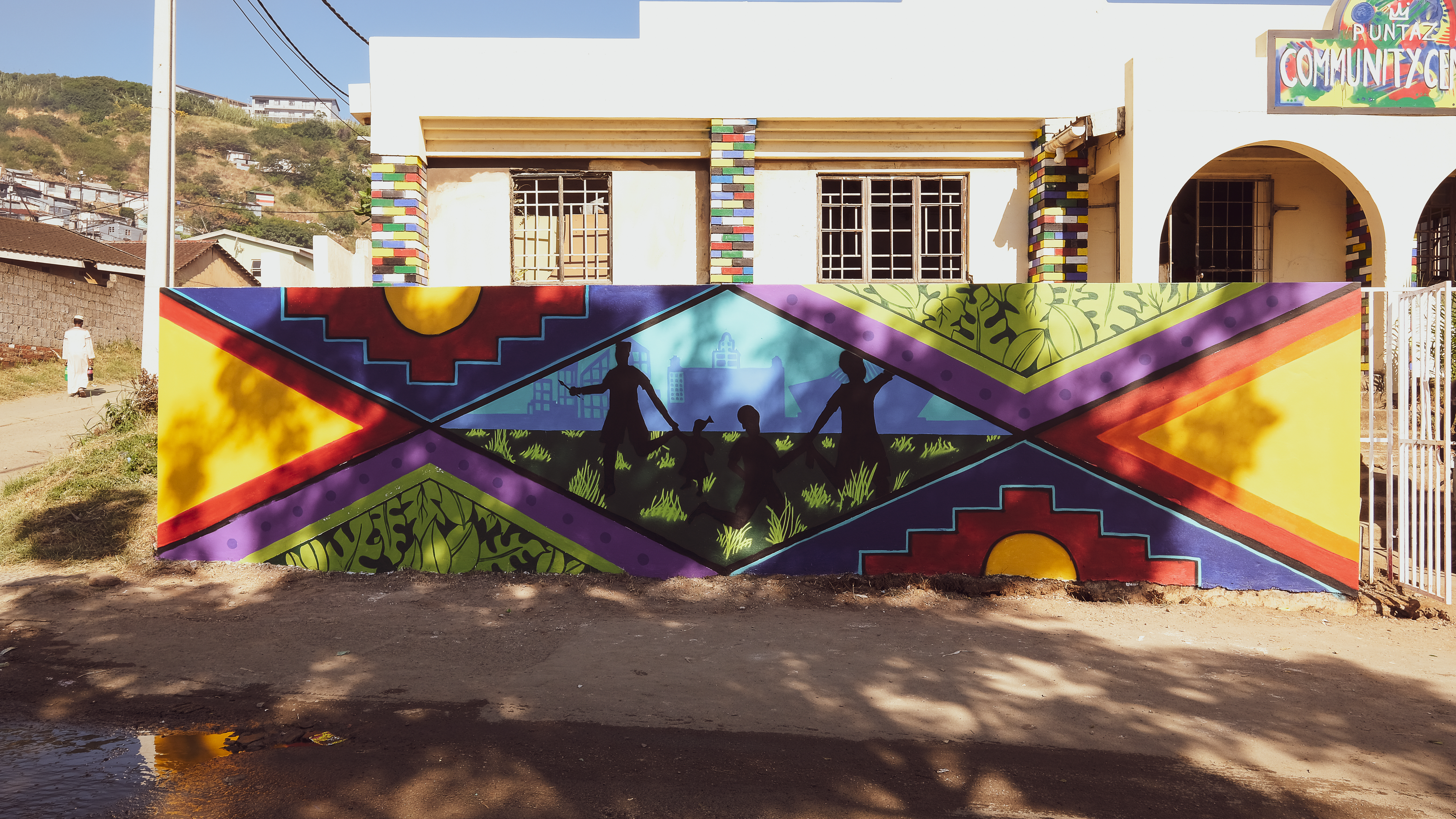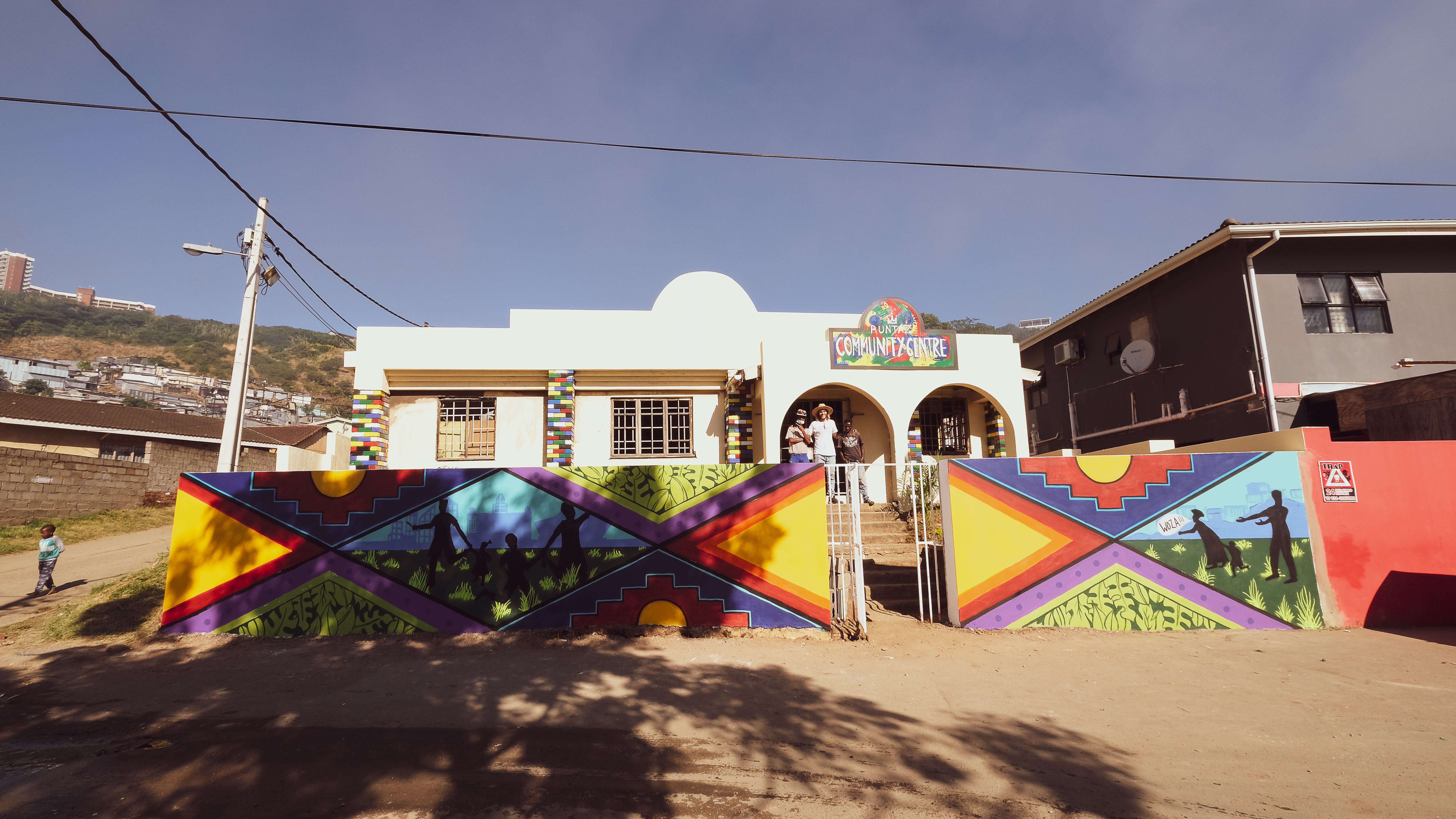 This project’s aim was to reimagine and reinvigorate a local community center in the Puntaz community of Durban, South Africa. Painting on Purpose, in partnership with community creatives lead by local artist Snqobile ‘Derek’ Masondo, took on the challenge of renovating and equipping the building, and installing an art room.